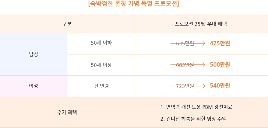 · 기본 : 복부초음파, 헬리코박터 항체, 위내시경, 대장내시경 (CO2 통증완화 내시경)